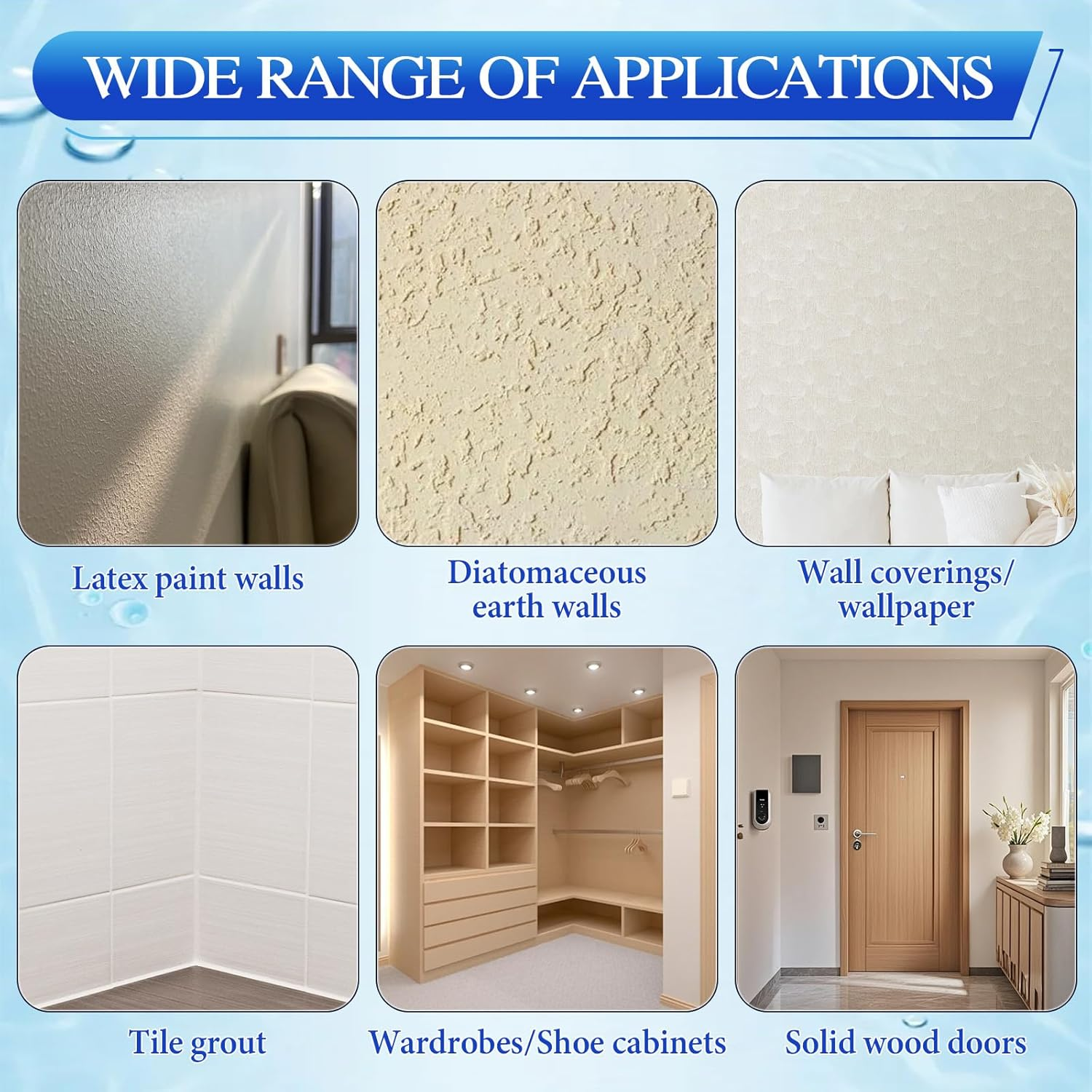 - Applications: Latex-painted walls, wallpaper, fabric, wood, tile, grout