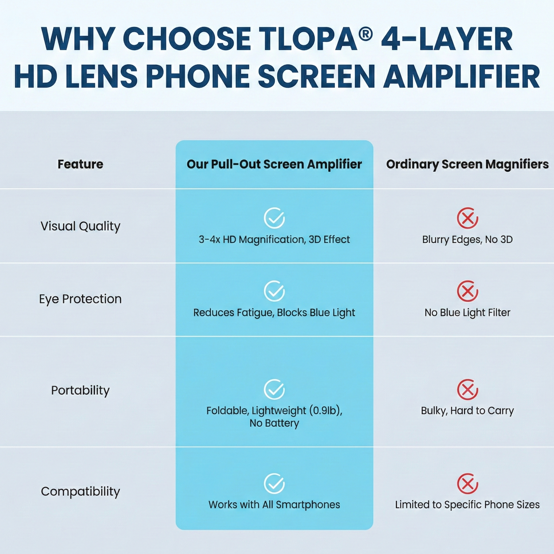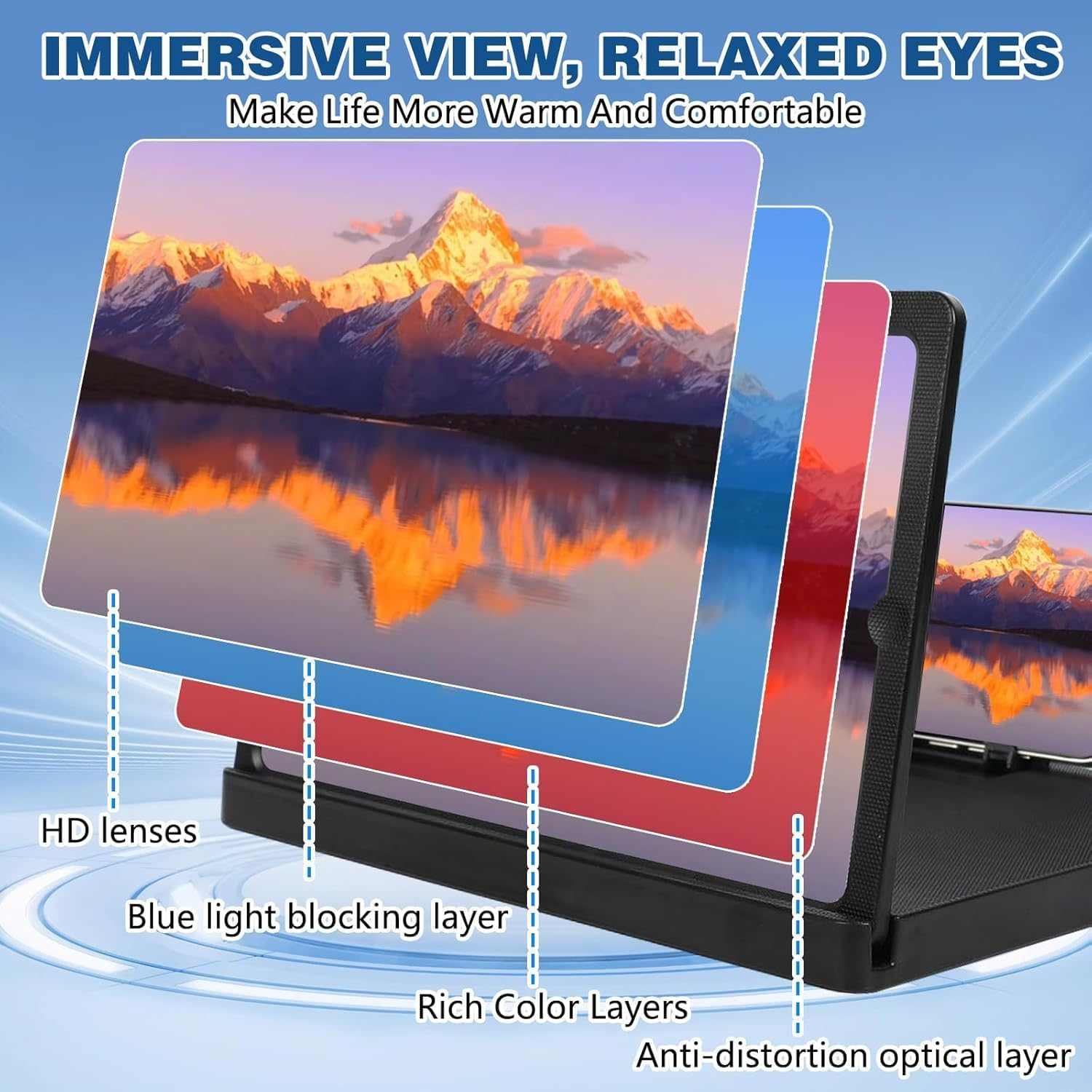 This TLOPA® 4-layer HD Lens Phone Screen Amplifier magnifies your screen by 3-4 times, delivering crisp 3D HD visuals while blocking harmful blue light. It is the ultimate upgrade for comfortable, immersive entertainment anywhere you go.