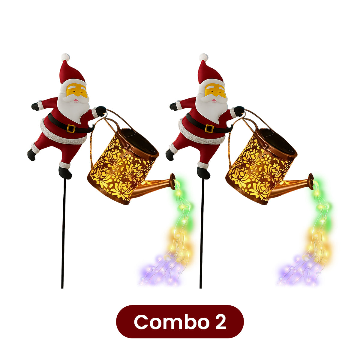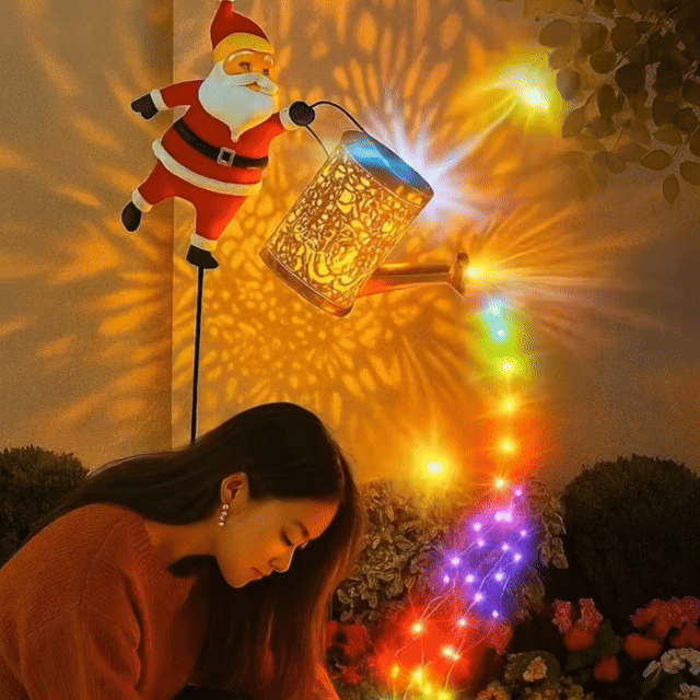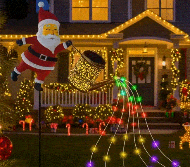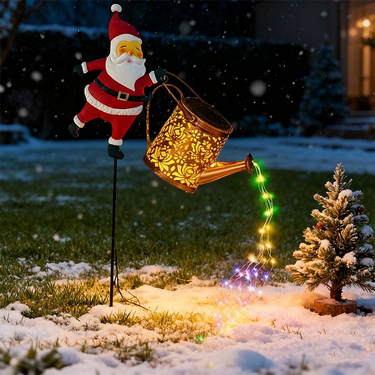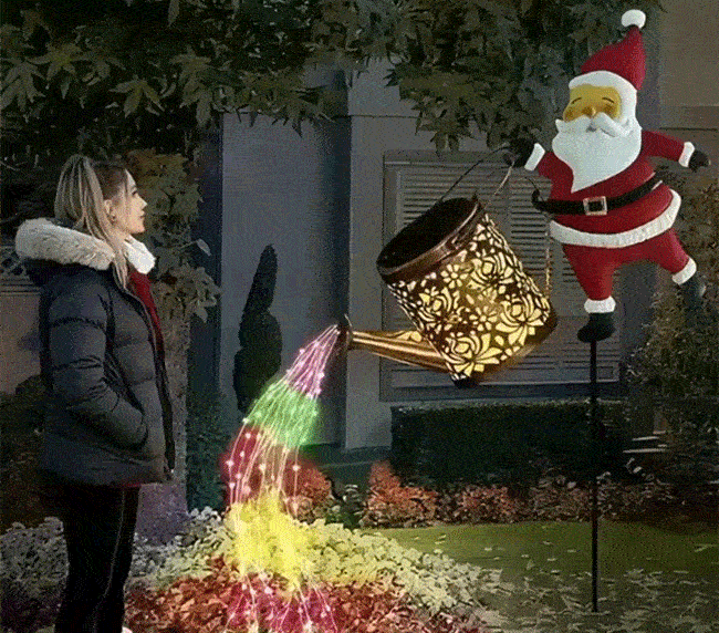 36 flickering LEDs cascade down six light strings, creating a breathtaking "flowing water" effect that brings your garden to life at night.Transform your outdoor space into a heartwarming holiday scene with the Solar Santa Watering Can Light where Santa pours out a stream of sparkling light each night.