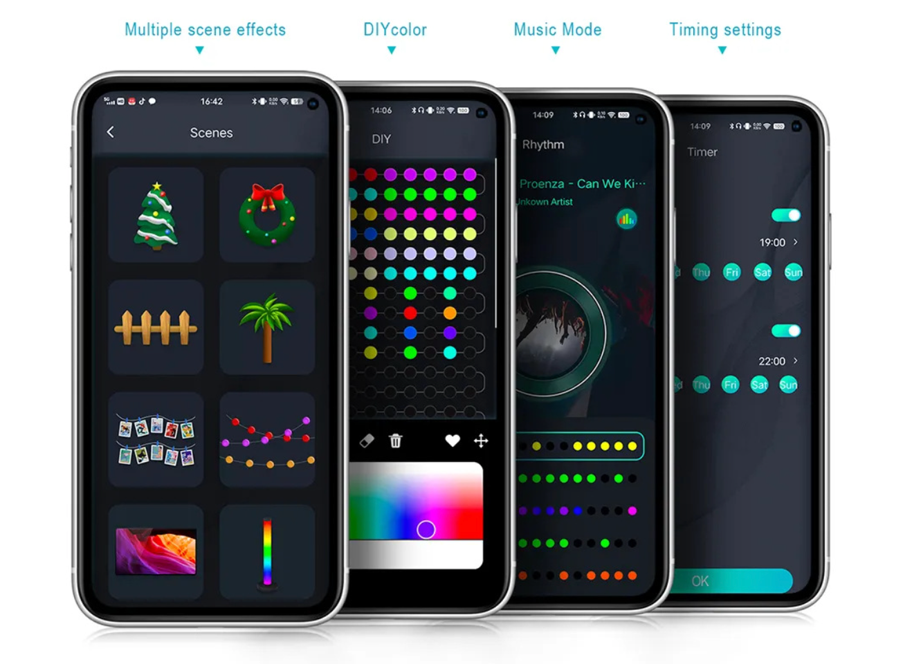 Manage your lights effortlessly through an intuitive smartphone app. Choose from a wide range of colors, adjust brightness, and set timers with just a few taps, giving you complete control at your fingertips.