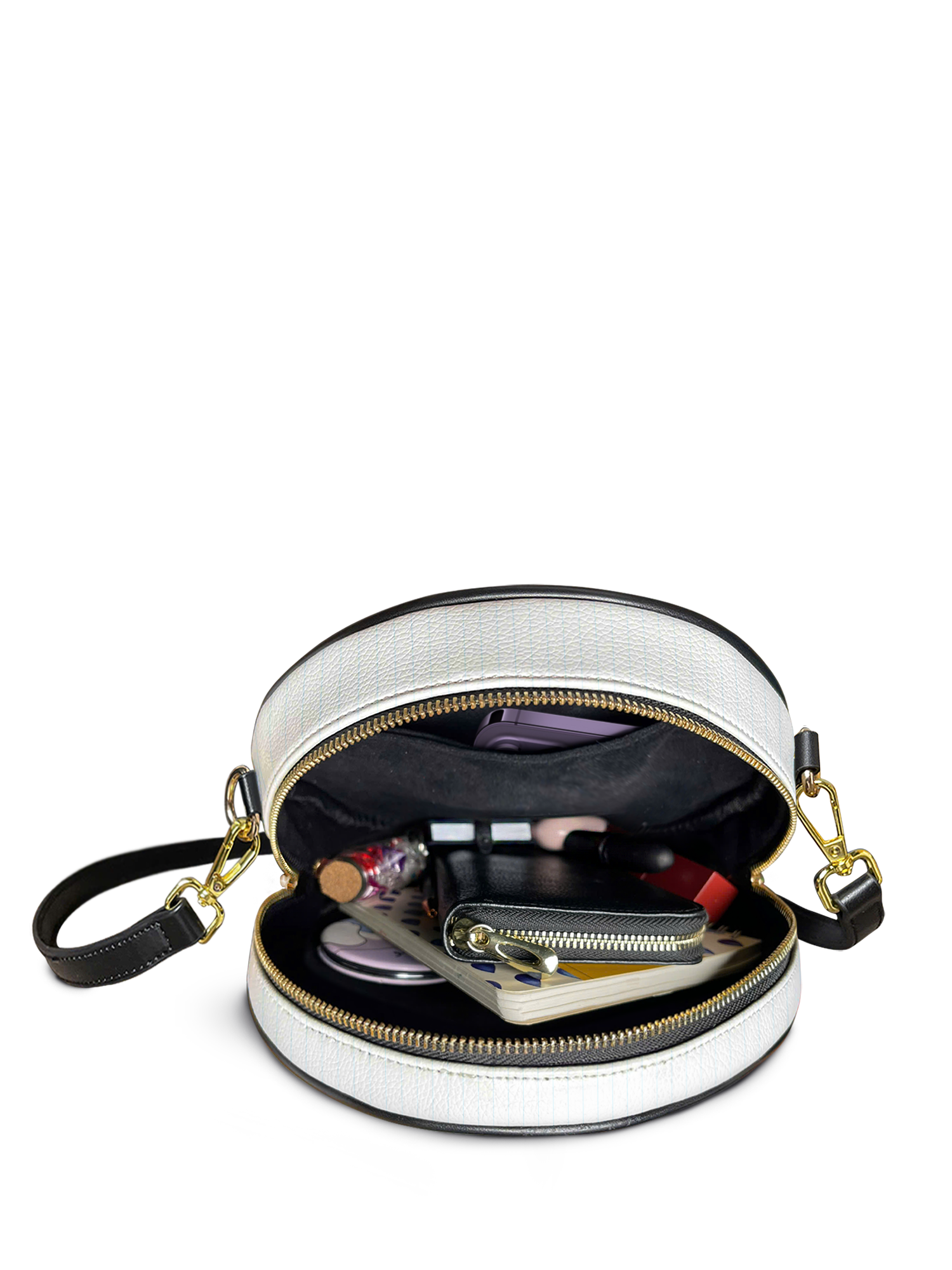 Crafted from high-quality leather, this bag boasts a unique circular silhouette that sets it apart from traditional purses. Its spacious interior ensures you can carry all your essentials with ease, whether you're running errands or heading out for a night on the town.