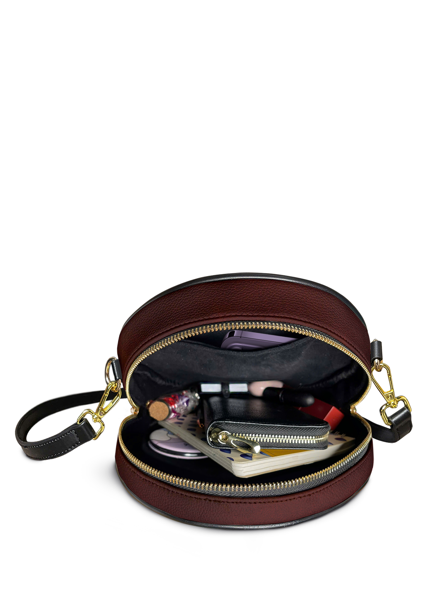 Crafted from high-quality leather, this bag boasts a unique circular silhouette that sets it apart from traditional purses. Its spacious interior ensures you can carry all your essentials with ease, whether you're running errands or heading out for a night on the town.
